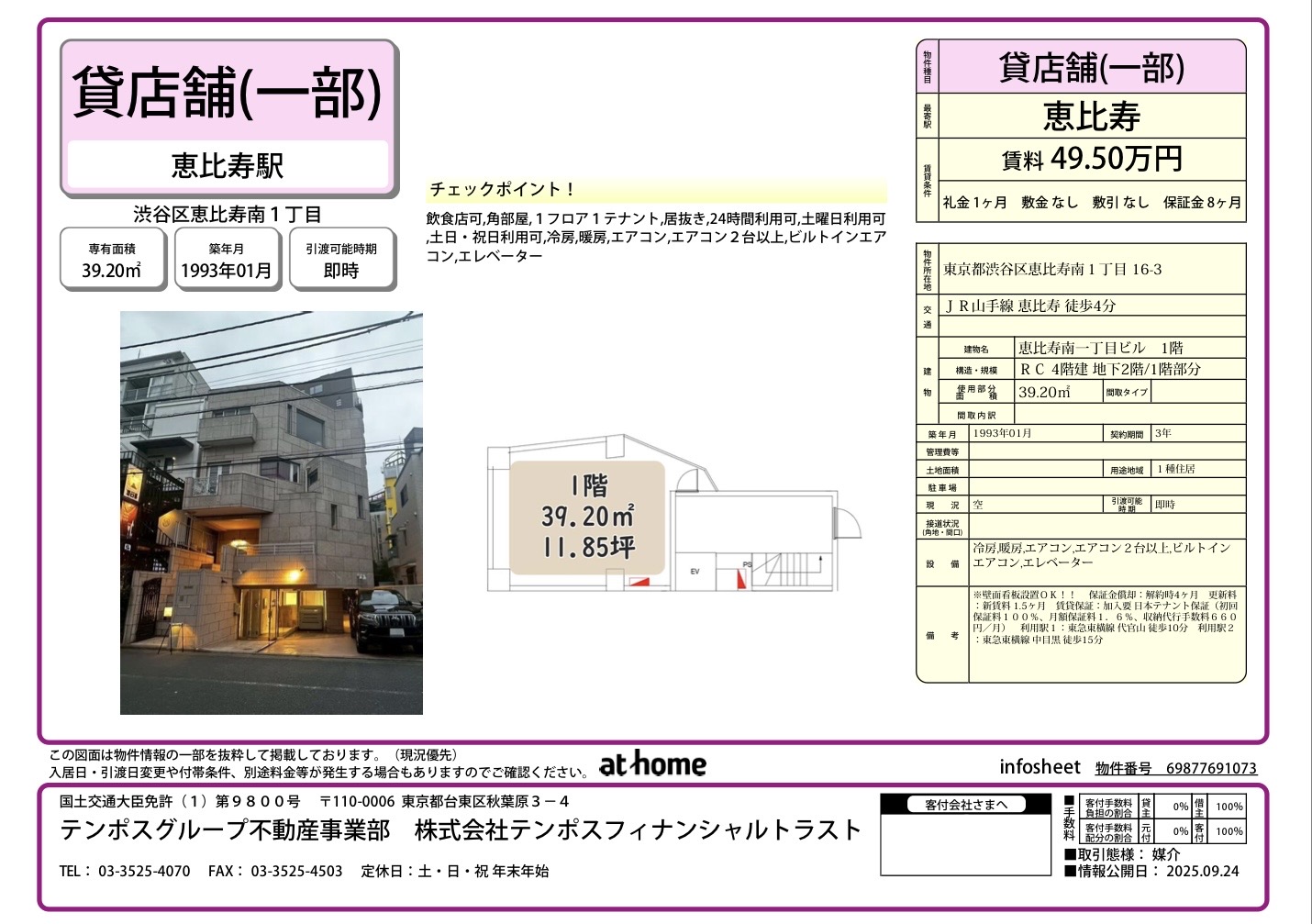 飲食店可 角部屋 1フロア1テナント 居抜き 24時間利用可 土曜日利用可 土日・祝日利用可