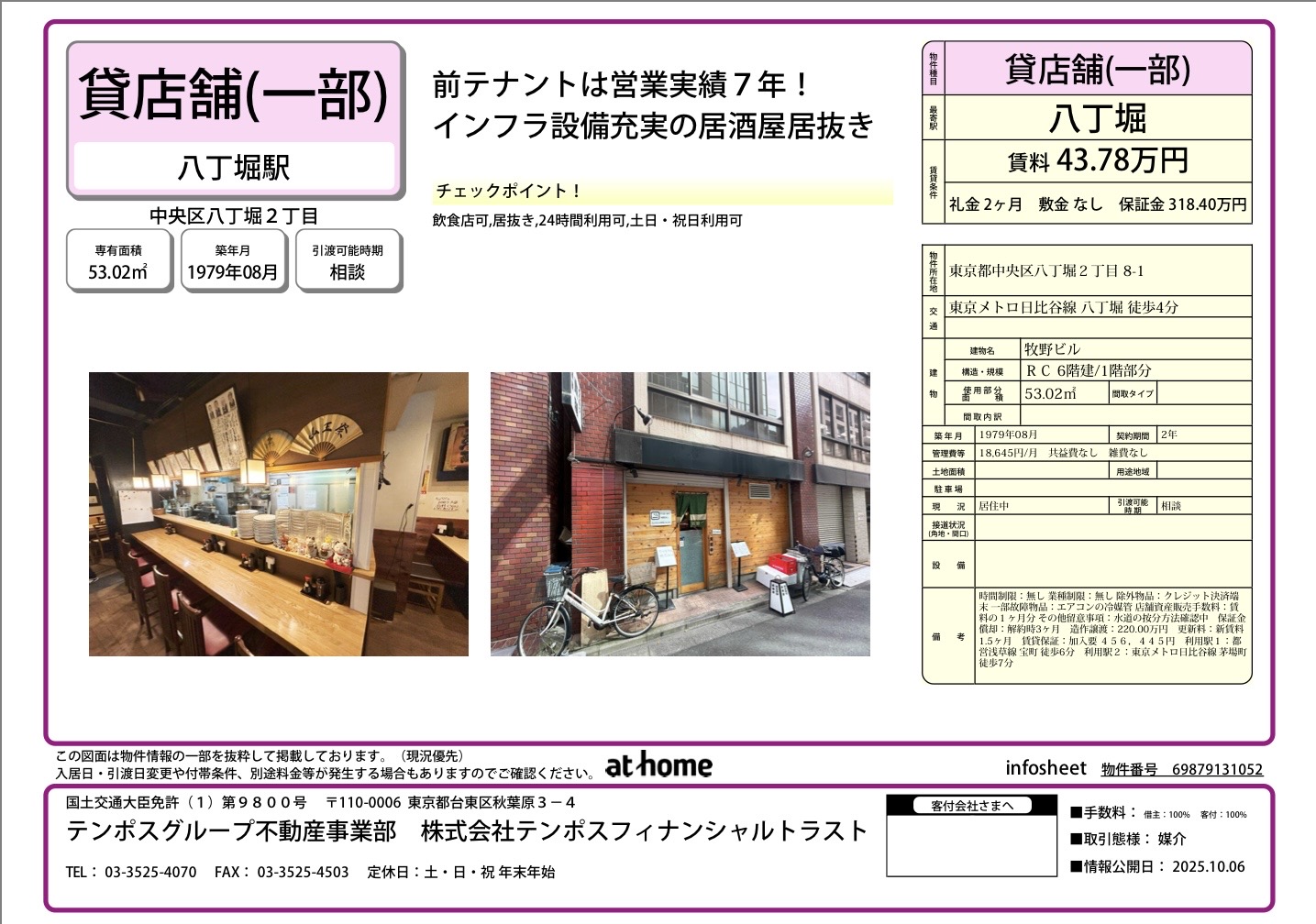 前テナント業種:居酒屋・ダイニングバー/ 業種補足説明:居酒屋